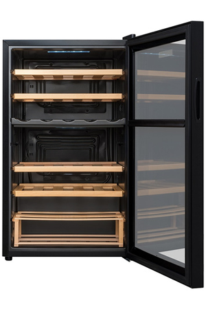 Cette cave de vieillissement possède une régulation électronique de 5°C à 18°C. La zone supérieure possède une amplitude de fonctionnement de 12-18°C et la zone inférieure de 5-14°C.