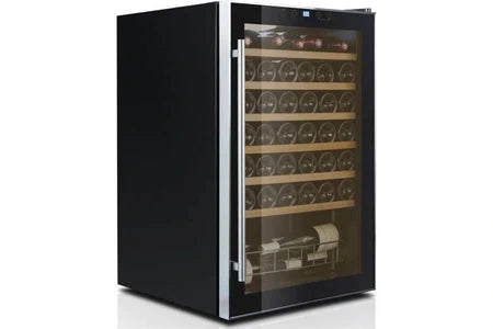 Service-48 bouteilles-Pose libre-L 55 x H 85 cm-Noir-129 L-Porte verre-Entourage porte inox-Poignée inox-Systeme anti vibration-Verre traité anti UV-6 clayettes bois-1 grille de présentation-Contrôle électronique-Eclairage LED - SN-N (10-32C)