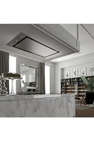 Cette hotte s’installe avec une gaine plate et peut ainsi être intégrée dans un faux plafond d’une hauteur de 20 cm seulement.