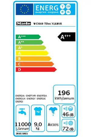 Le lave-linge frontal Miele WCI 660 TWINDOS blanc avec porte chrome, est doté d'une capacité de lavage de 9 kg, 15 programmes de lavage dont 1 programme Couettes , d'un Moteur Induction (fiabilité et robustesse) et d'un système Anti-Vibrations. Ultra basse consommation, cette machine à laver bénéficie de la classe énergétique A+++-10%, ce qui permet 40% d'économie par rapport à un appareil de classe A.