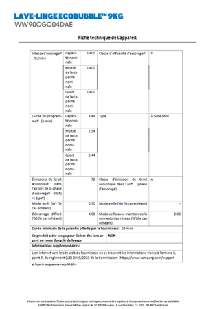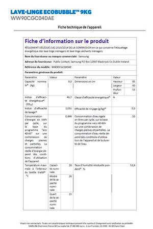 Le lave-linge Samsung WW90CGC04DAE blanc avec contour hublot noir, d'une capacité de 9 kg (Tambour 61 L) est doté 20 programmes dont un programmes Anti-Allergènes (via vapeur), d'une technologie Ecobubble qui transforme la lessive en mousse ultra-performante, même à basse température, d'une option Anti-tache et d'une connectivité wifi SmartThings.