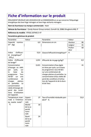 - Capacité 6 kg ( Volume du tambour 46 L) - Classe énergétique A