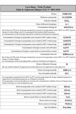 Le lave-linge top Vedette VLT1255W blanc, est doté d'une capacité 5,5 kg pour une dimension réduite (40 cm), d'une option " couleurs foncées"et d'une touche "Favori". Basse consommation, cette machine à laver bénéficie d'une classe énergétique D.