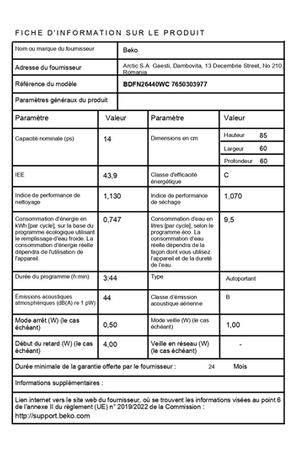 - Largeur 60 cm (14 couverts) - 44 d - Classe énergétique C