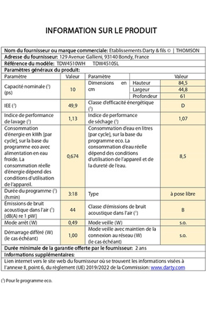- Largeur 45 cm (10 couverts) - 44dB - Classe énergétique D