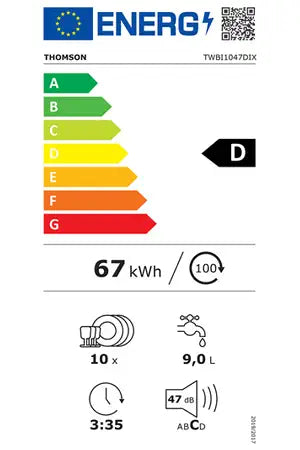 Le lave-vaisselle intégrable Thomson TWBI1047DIX avec Argent Métal est doté d'une grande capacité de 10 couverts, 7 Programmes : Auto, Intensif, Universel, Eco, 90 Min, Verre, Rapides et une option demi-charge.