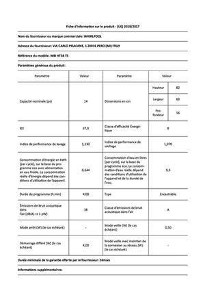 - Consommation d'eau 9.5 L/cycle - Classe énergétique B