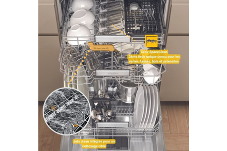 Un 3ème tiroir unique conçu pour les bols, les tasses et les verres jusqu'à 13 cm. Ses jets d'eau intégrés garantissent un nettoyage parfait.