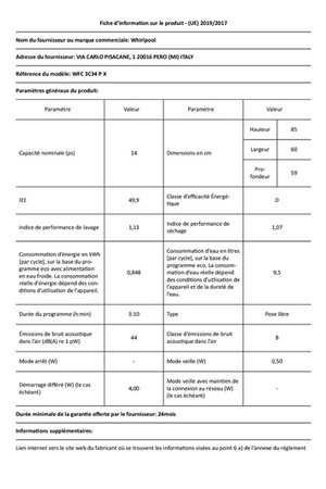 - Largeur 60 cm (14 couverts) - 44dB - Classe énergétique D