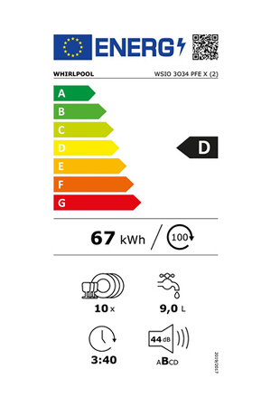 Le lave-vaisselle Whirlpool WSIO3O34PFEX blanc bénéficie d'une capacité de 10 couverts, de 8 programmes dont le programme 6ème Sens, d'une option Power Clean Pro et d'un système Natural Dry : + 70% d'amélioration de séchage.